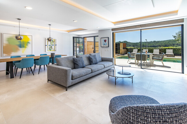 3 dormitorios, 2 baños modernos, piscina privada, gimnasio en casa totalmente equipado, zona de barbacoa con terraza cubierta, garaje grande con amplio espacio para vehículos y almacenamiento, interior de alta calidad y con estilo, cocina americana con electrodomésticos integrados de marca, aire acondicionado y calefacción por suelo radiante, vistas panorámicas al campo, ubicación tranquila y natural en Es Capdella.