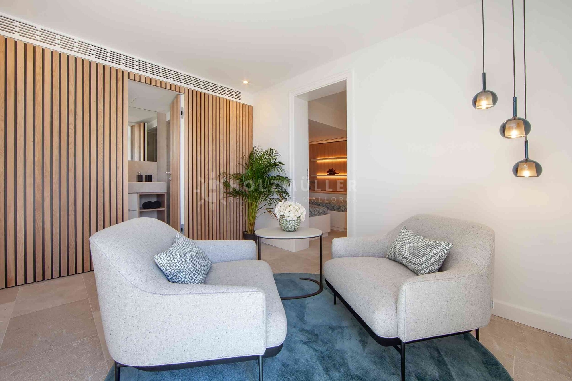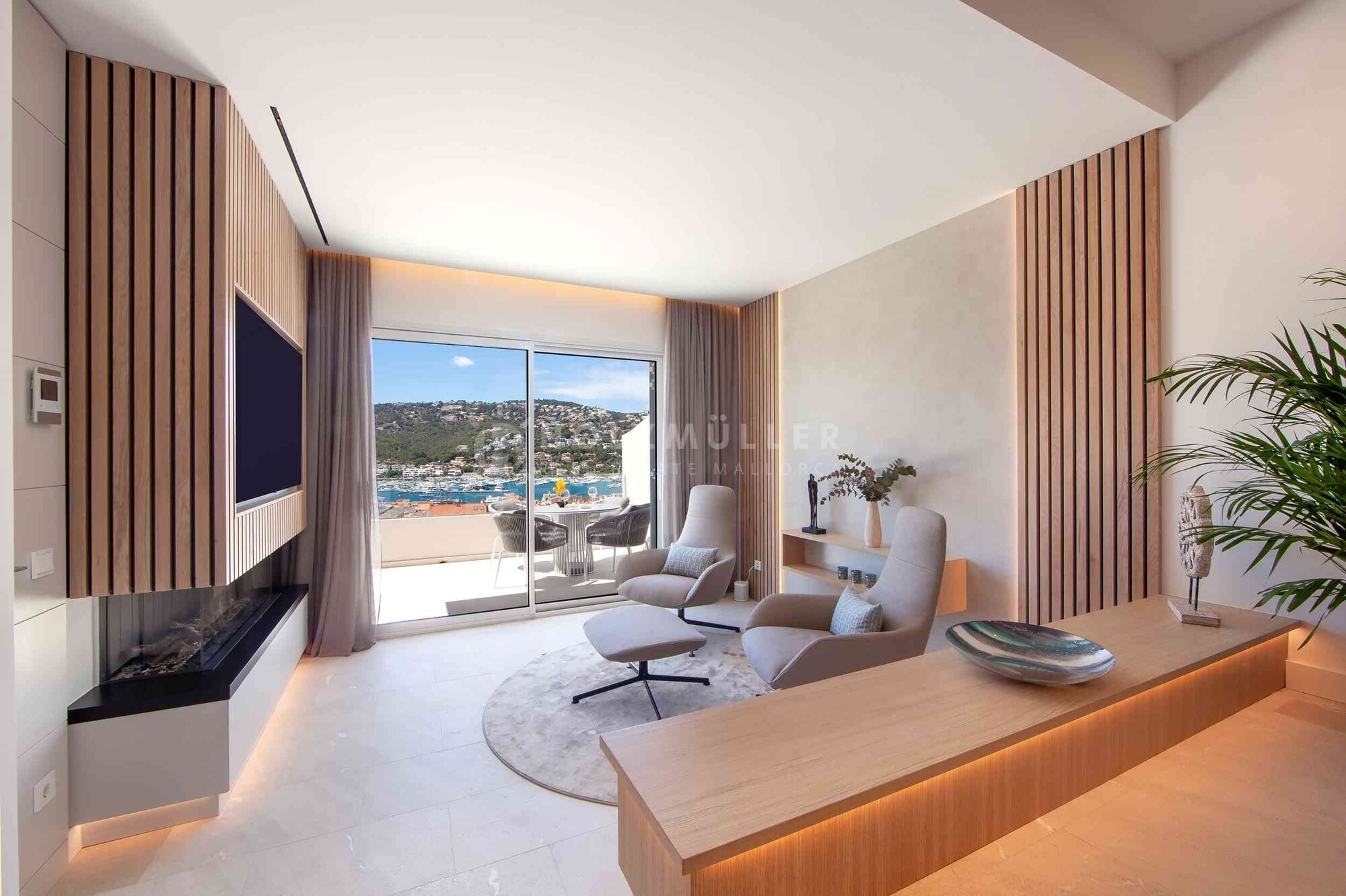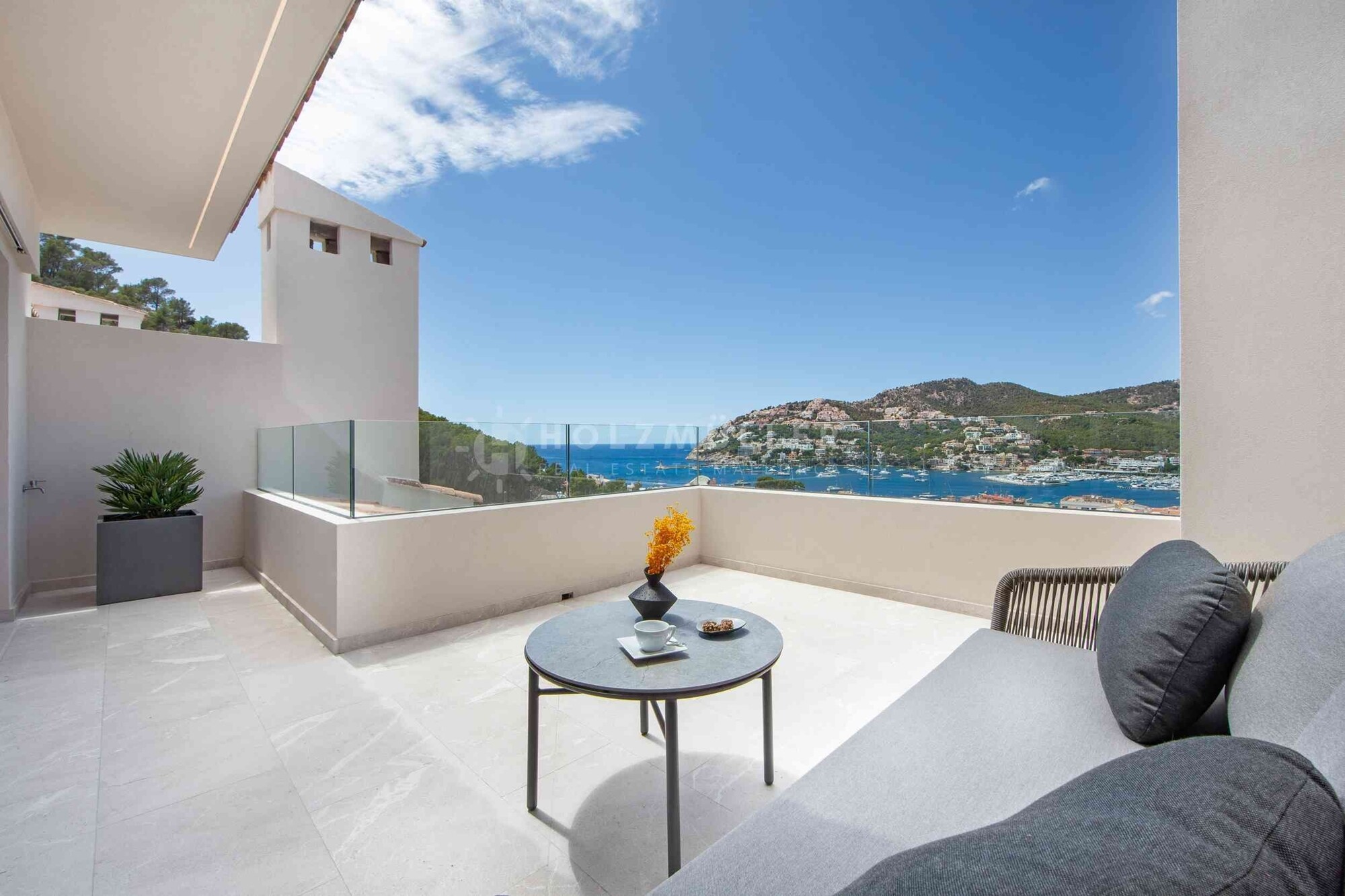 Adosado de primera clase, completamente reformado en 2023, ubicación céntrica, vistas espectaculares al puerto y al mar, gran piscina comunitaria, estilo mediterráneo moderno, materiales y equipamiento de muy alta calidad, salón/comedor, cocina abierta, lavadero, 4 dormitorios, 3 baños, aseo de invitados, 2 terrazas (18m² y 16m²), azotea con zona de barbacoa (34m²), bomba de calor de aire para calefacción por suelo radiante y aire acondicionado, chimenea de gas, sistema de ventilación cuando no está en uso, exclusivos suelos de madera y suelos de piedra natural, muebles empotrados hechos a mano de Austria, sistema domótico (KNX Smart Home System), sistema de sonido SONOS, muebles de alta calidad incluidos