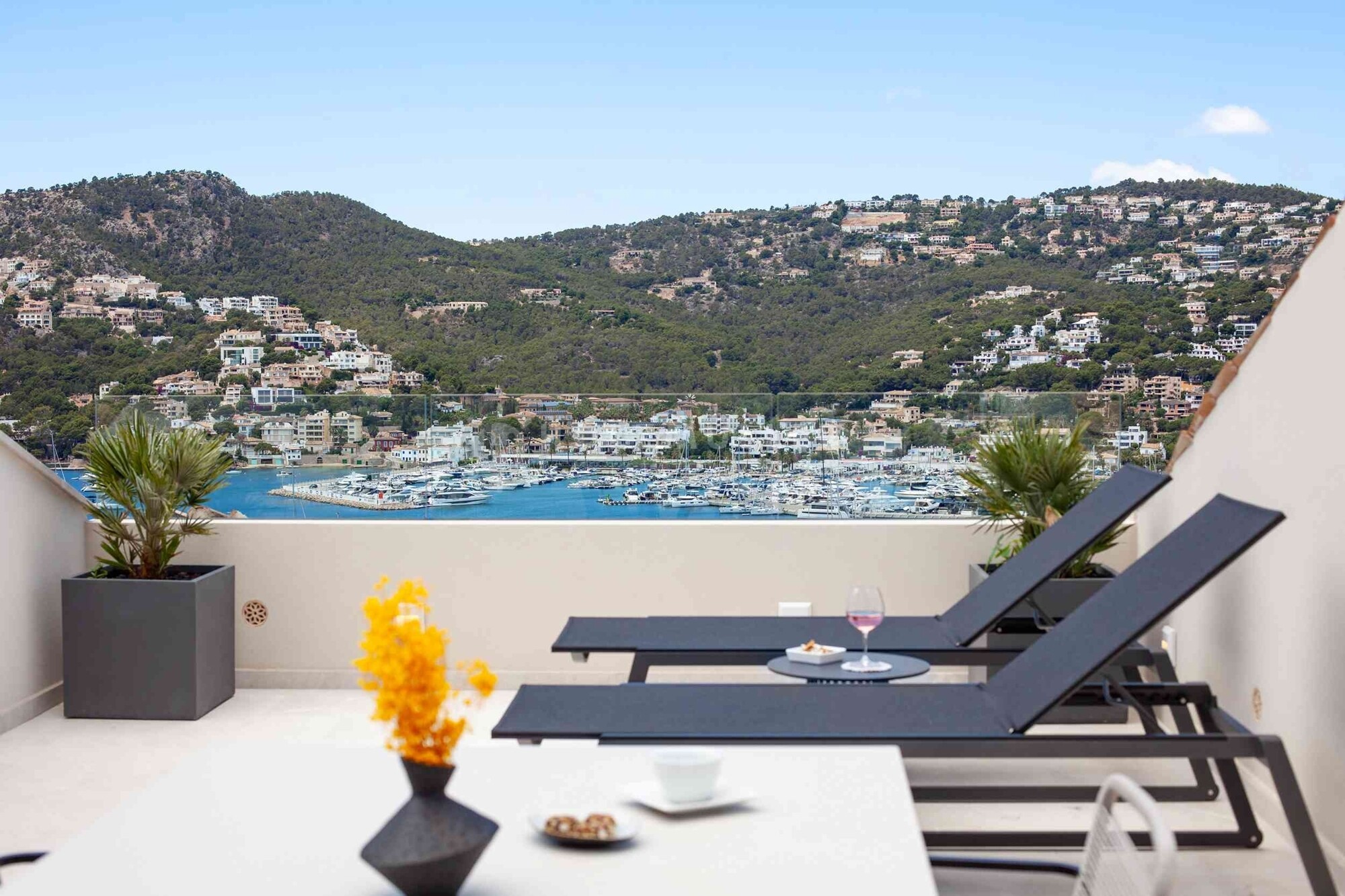 La casa adosada de lujo ofrece en la zona principal (planta baja + planta superior) un hermoso salón / comedor con cocina abierta, un lavadero, dos terrazas con vistas al mar y al puerto, tres dormitorios, dos baños y un aseo de invitados. También hay un apartamento de invitados en el sótano con una sala de estar, dormitorio y baño. Otro punto a destacar es la sensacional azotea con zona de barbacoa y vistas únicas a todo el puerto. La zona comunitaria ofrece más terrazas, una hermosa piscina y jardines mediterráneos.