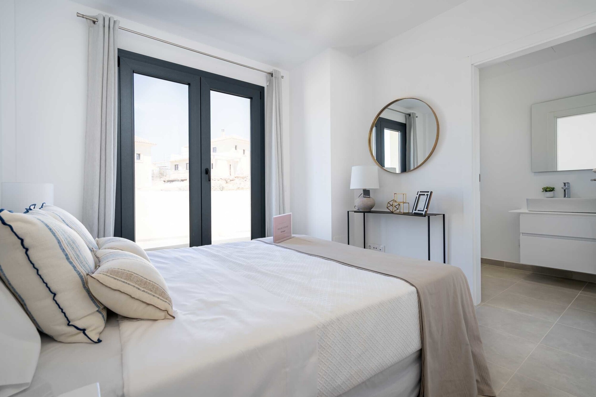 El chalet independiente (tipo de casa E+) ofrece en la planta baja un salón-comedor con cocina americana, lavadero, trastero, zona de trabajo, dos dormitorios y dos cuartos de baño. En la planta superior hay otros dos dormitorios, dos baños y cuatro balcones. Lo más destacado es la hermosa zona exterior con piscina privada (opcional), jardín y terrazas. La villa dispone de dos plazas de aparcamiento privado. La zona comunitaria ofrece varias piscinas (exterior), piscina (interior), sauna, gimnasio, gastro bar, cine y jardines paisajísticos.